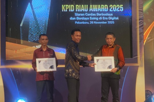 PEKANBARU (SuaraPelalawan)-Pemerintah Kabupaten Pelalawan kembali menorehkan prestasi membanggakan di tingkat Provinsi Riau. Pada ajang KPID Riau Award 2025, Pelalawan berhasil meraih dua penghargaan sekaligus, yakni Kategori Pemerintah Peduli Penyiaran dan Lembaga Penyiaran Publik Lokal (LPPL) Terbaik yang diraih oleh Radio Bono FM. Penghargaan diserahkan di Ballroom Graha Pena Pekanbaru, Rabu malam (26/11/2025).